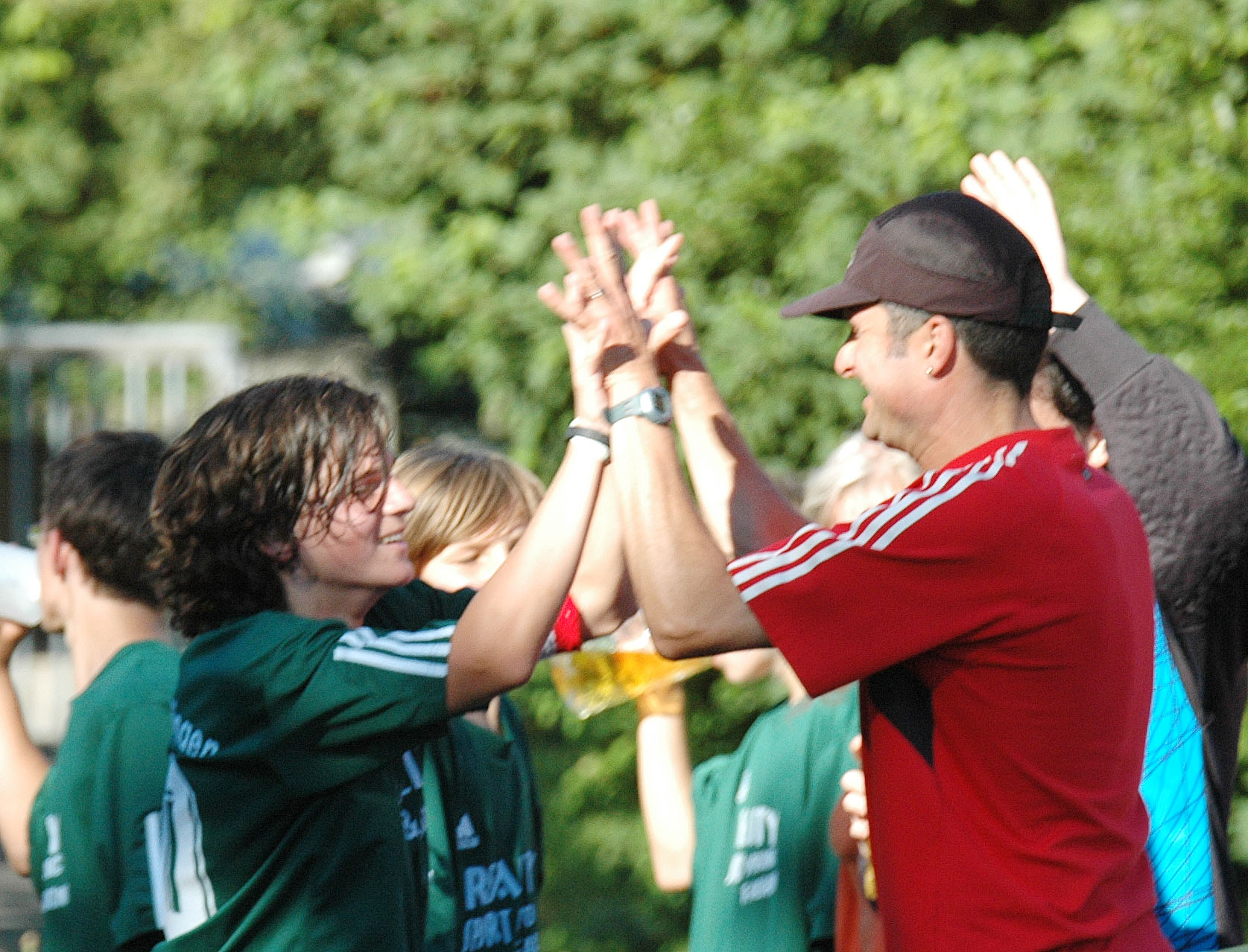 C-Junioren-BOL: TSV Kottern - FCG 3:1 FCG feiert Klassenerhalt (WAB). Das Gefühl hat nicht getrügt. "Wir schaffen es", war sich Trainer Rainer Wanek sicher, und tatsächlich haben die Fußball-C-Junioren des FC Gundelfingen den Klassenerhalt in der höchsten Spielklasse, der Bezirksoberliga, perfekt gemacht. Im Entscheidungsspiel um den weiteren Verbleib im schwäbischen Oberhaus bezwangen die Grün-Weißen den TSV Kottern mit 3:1 (0:0). Dabei waren die Allgäuer in der in Thannhausen ausgetragenen Partie durch Manuel Wiedemann (39.) in Führung gegangen, doch der Rückstand weckte die Gundelfinger. Bereits zwei Minuten später bediente der zum FC Augsburg wechselnde Sebastian Schaller mit einem tollen Pass Sebastian Unfried - 1:1. Unfried sorgte in der 50. Minute auch für die Führung, ehe nach einem sehenswerten Schaller-Solo Eduard Thommy nur noch den Fuß hinzuhalten brauchte und den 3:1-Sieg perfekt machte (62.). Das Bild zeigt Sebastian Schaller (links), der sich mit Trainer Rainer Wanek über den Erfolg freut. Bild: Brugger |